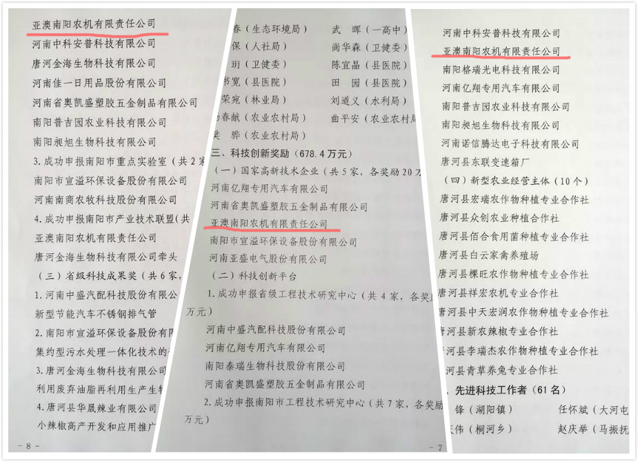 亞澳農機共獲得政府獎勵35萬元。包括成功申報國家高新技術企業(yè)20萬元獎勵、市級工程技術研究中心5萬元獎勵、南陽市產業(yè)技術聯盟10萬元獎勵10萬元。