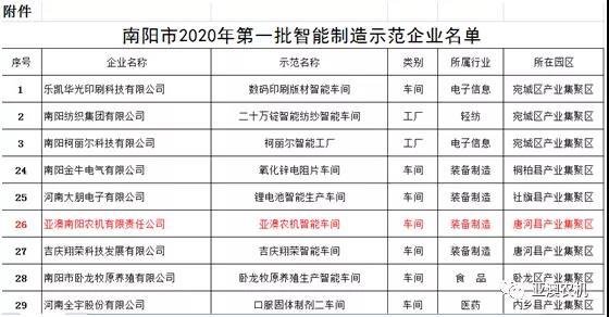 南陽(yáng)市2020年第一批智能制造示范企業(yè)名單公布, 亞澳農(nóng)機(jī)入選