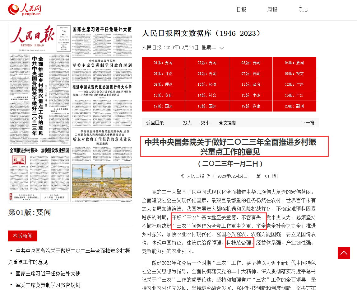 2023年中央一號文件2月13日正式發布。文件提出,要立足國情農情,體現中國特色,建設供給保障強、科技裝備強、經營體系強、產業韌性強、競爭能力強的農業強國。